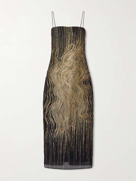 Taller Marmo's dress evokes the high-octane glamour of a '70s 'Showgirl'. Made from silk-blend crepon, it's woven with gold threads that shimmer as you dance and has a classic column shape. Lift the midi hem with heels.