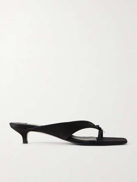 We love shoes that work with both dresses and denim. Case in point, TOTEME's sandals are made from satin and rest on a comfortable kitten heel. They're finished with tiny bows at the toe.