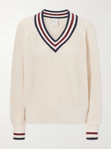 Varley's 'Maurice' sweater evokes preppy, academic-inspired styles. Made from cotton in an open-knit construction, it's detailed with multicolored stripes along the V-neckline and cuffs. Style it over a shirt with a pleated mini skirt.