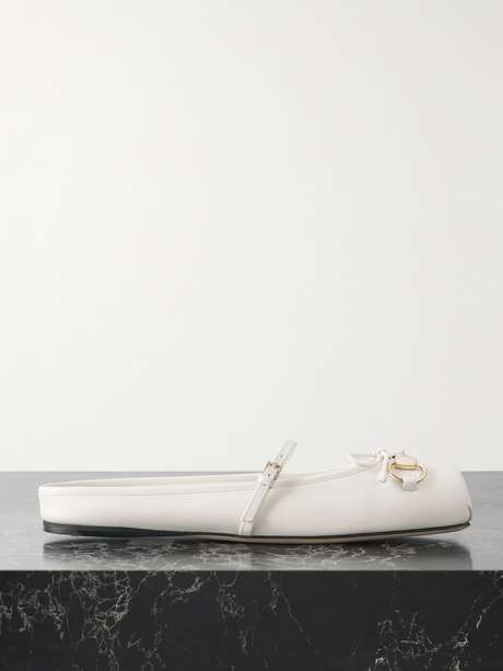 Gucci's ballet flats are designed with square toes that nod to classic pointe styles worn by dancers. They're made from smooth leather and feature the gold-tone horsebit alongside a dainty bow. Adjust the slim strap to customize the fit.