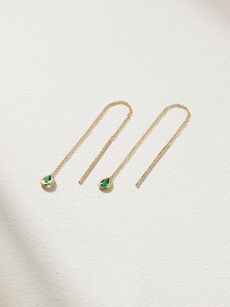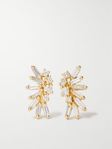 If you’re keeping your gown lightweight to cope with exotic climes, your jewelry needs to echo this aesthetic. Fine chains and slim, sculptural forms will complement a sand-skimming dress, so look to Octavia Elizabeth’s ‘Nesting Gem’ 18-karat recycled gold and diamond earrings, or Ileana Makri’s ‘Grass Palm’ design – both will catch the sunlight and elegantly scintillate as you walk down the aisle. Looking for a classic pair of diamond earrings but can’t quite decide which silhouette to settle on? Try Jennifer Meyer’s sleek, simple 18-karat-gold drop earrings. Featuring a unique combination of baguette-cut and illusion-cut diamonds, they’ll work with any wedding dress, but can also be paired with tailoring for the office and dressed down with denim for the weekends – offering an easy way to add happy memories to every outfit you own.