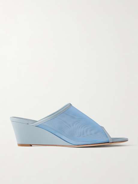 Aeyde's 'Suzanne' mules reflect '90s minimalism, featuring a wide mesh strap trimmed with leather and set on a mid-height wedge for everyday comfort.