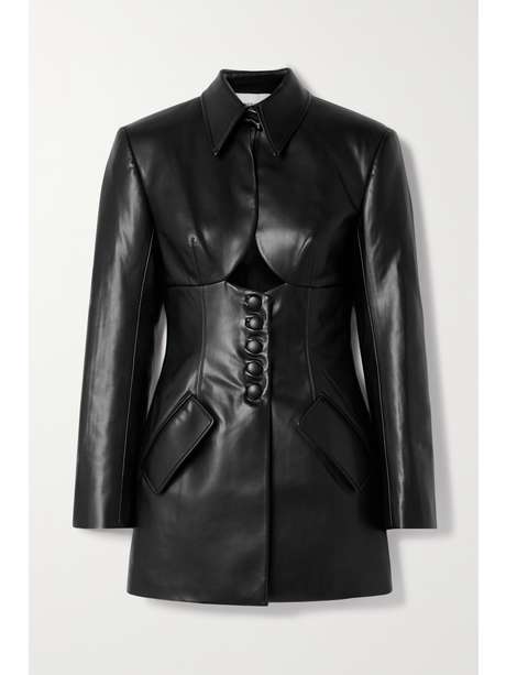 Aleksandre Akhalkatsishvili combines details from sharp tailoring and flattering corsets to create this bold dress. Made from panels of supple black faux leather in a slim silhouette, it has a cutout just above the nipped-in waist, which is highlighted by covered buttons. The neat collar and structured shoulders give it a sharp edge. Wear yours with vibrant sandals.