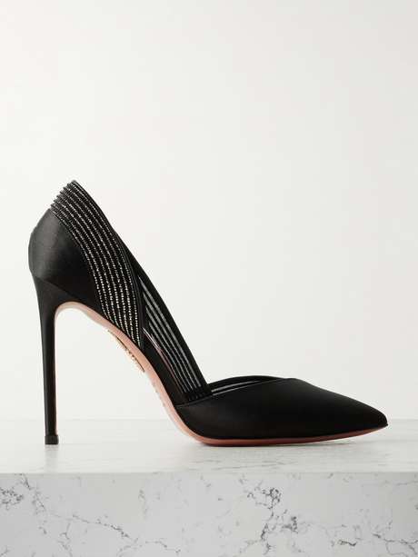 Aquazzura's pumps are adorned with hundreds of petite crystals that 'Shimmer' in the light. Expertly handcrafted in Italy, they're made from lustrous satin with tonal mesh and leather trims and elegant pointed toes. The pin-thin heels offer 105mm of lift.