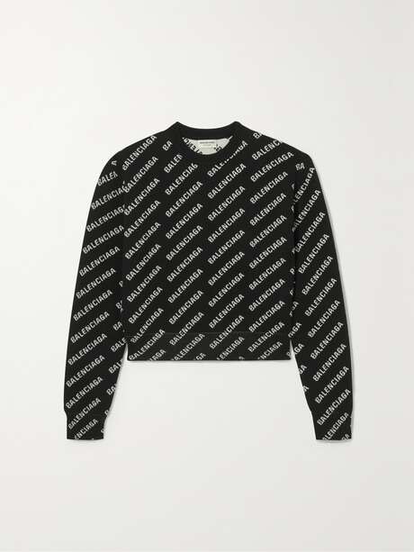 Balenciaga's sweater is patterned with repeated versions of the label's logo. It's intarsia-knitted with generous amounts of cotton and wool for softness and has a 'shrunken', cropped shape. Style yours with slouchy jeans and chunky slides.