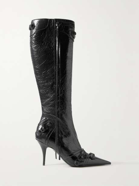 Balenciaga's 'Le Cagole' knee boots are designed with long, swaying zipper pulls and studded hardware, including buckles, just like the iconic bags of the same name. Made from crinkled-leather, they have sleek pointed toes and 90mm heels. Wear yours with mini skirts and dresses.