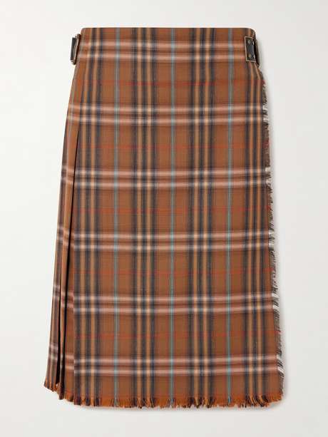 Burberry's skirt has a pleated, wrapped design that riffs on traditional Scottish kilts. Made in the UK from wool, it's woven with a heritage check and has frayed edges and buckled tabs that add a modern touch.