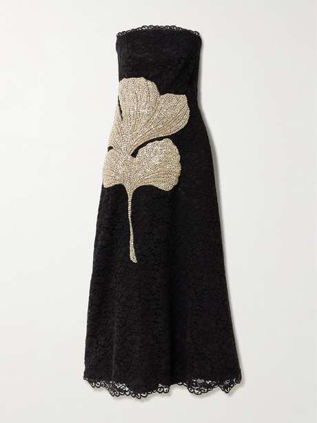 Wonderfully delicate and beautifully ornate, Costarellos' strapless 'Hallis' dress is cut from corded lace embellished with hand-applied, light-catching crystals in a floral form. Designed for a figure-skimming A-line profile, it's traced with gently scalloped edges.