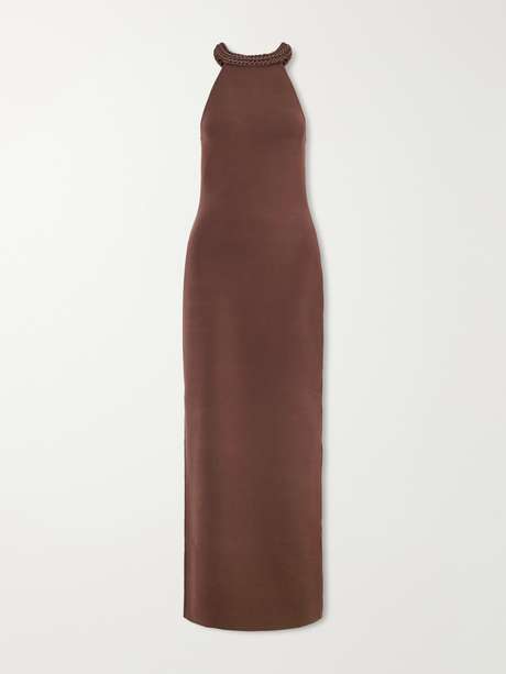 Cult Gaia’s 'Cassidy' maxi dress is defined by its sculptural simplicity. Knitted for a close fit, it falls from a halter neckline traced with a braided collar that draws the eye to the shoulders.