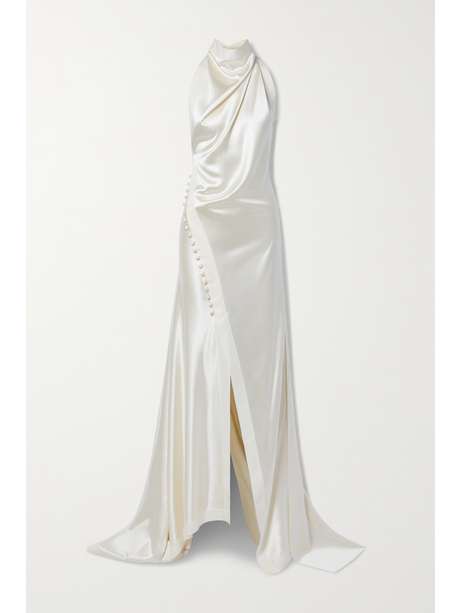 Danielle Frankel's 'Sasha' gown is brimming with romantic elements, like a draped cowl neckline and decorative covered buttons diagonally tracing the hip. Cut from glossy silk-charmeuse, it has a slightly loose fit and falls to a pooling hem with a knee-grazing split. The languid bustle has a loop at the end, so you can work the room with ease on your big day.