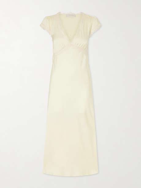 This 'Gala' dress mirrors FAITHFULL’s romantic codes. Draped from lustrous satin in a buttery yellow, it’s lightly gathered at the V-neckline and traced with dainty lace along the seams.