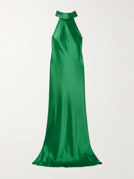You'll feel so elegant and glamorous in Galvan's slinky 'Sienna' gown. Bias-cut from fluid satin to skim your curves, it falls to a full-length hem and has a high halterneck with ties that flow behind as you walk. Wear yours with gold jewelry.