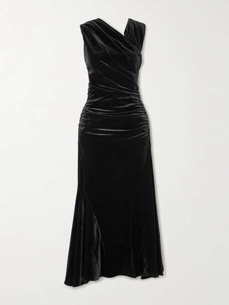 Exuding understated glamour, GANNI's dress is made from lustrous recycled-velvet that's ruched to accentuate your every curve. It has a wrap-effect bodice with crossover straps at the back and falls to an asymmetric hem. Style yours with sculptural jewelry.