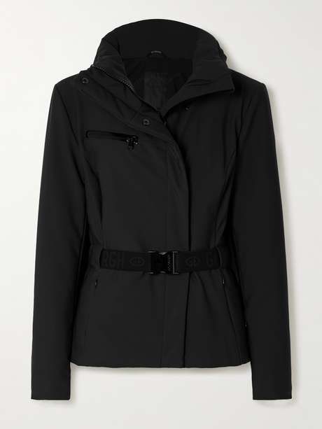 Goldbergh's 'Elegante' ski jacket packs layers of insulation in a sleek, sharp profile. Cut from black shell, this style has exaggerated shoulders and is belted at the waist - the internal gaiter ensures the perfect fit, keeping you warm even during snowfall. It's fitted with practical zipped cuffs and pockets, plus a protective funnel neck.