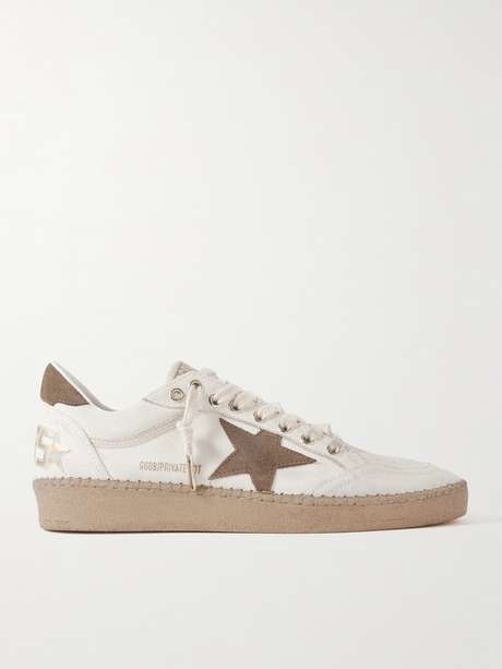 EXCLUSIVE AT NET-A-PORTER. Golden Goose's 'Ball Star' sneakers come pre-distressed to look like your most worn pair. They're made from canvas and trimmed with signature suede stars. The heels are printed with metallic lettering - side by side, it spells out 'sneakers'.