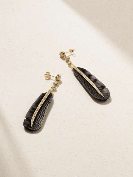 Jacquie Aiche often incorporates nods to her Native American heritage into her jewelry - these earrings are adorned with dangling feather pendants carved from bone. They're handmade from 14-karat gold and illuminated by sparkling diamonds.