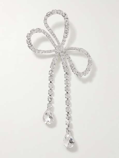Jennifer Behr's 'Evelyn' brooch will add a romantic and glamorous finishing touch to your outfits. It's handmade from rhodium-plated brass in the shape of a bow and encrusted with sparkling crystals anchored by large pear-cut drops.