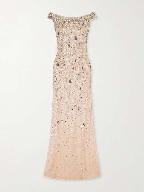 Jenny Packham's gown echoes the brand's ethereal flair. Crafted from tulle, it falls from an off-the-shoulder neckline and is traced with tonal embellishments that catch the light beautifully before falling to a sweeping hem.