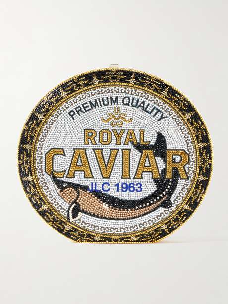 Judith Leiber Couture's clutch is set with over 14,000 colorful crystals to depict a 'Royal Caviar' tin. It's made from silver-tone brass and has a metallic leather-lined interior that can fit your cards and lipstick. Attach the chain strap so you can easily scoop up the namesake delicacy at your next party.