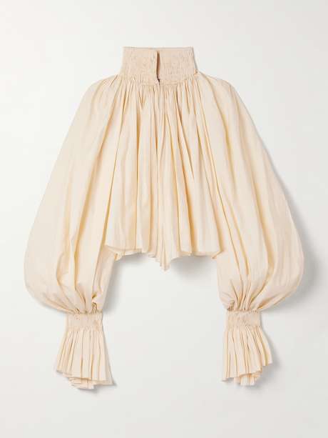 KHAITE's vintage-inspired 'Durer' blouse is intricately gathered along the high neck and tapered sleeves, creating defined pleats with plenty of volume. It's made from cotton-blend poplin and has a plunging neckline.