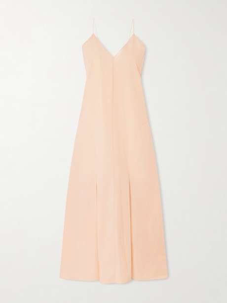 KHAITE's 'Iben' dress will elevate your warm-weather wardrobe with its dusty peach hue and elongating lines. Cut from crisp cotton-poplin, it skims your figure before falling into a paneled A-line skirt. Ground it with pared-back sandals and accessories to highlight its modern, sculptural simplicity.
