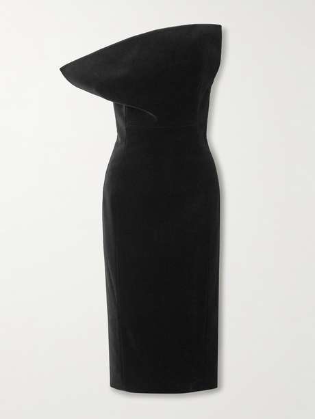 KHAITE's 'Sato' dress has a sculptural strapless neckline with an artful drape. It's cut from plush velvet in a figure-skimming column silhouette with a knee-length hem. Keep your accessories simple with heels and a clutch.