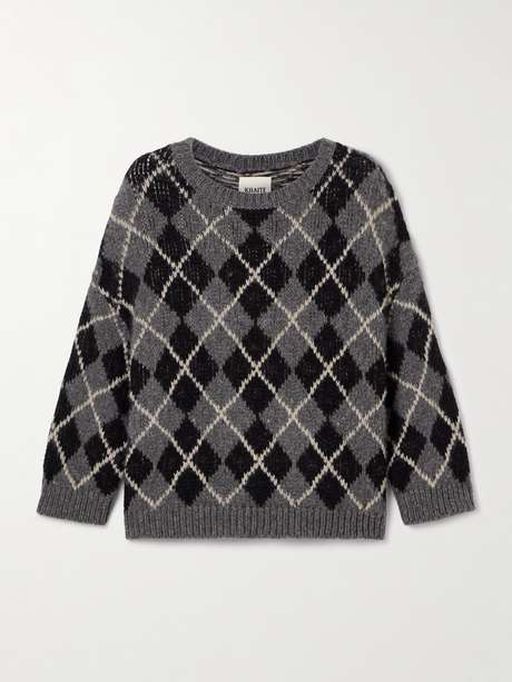 KHAITE's 'Colt' sweater is jacquard-knitted with a traditional argyle pattern in shades of gray and black. Part of the Fall '25 lineup, it's made from sumptuous cashmere and has a boxy fit and ribbed trims.