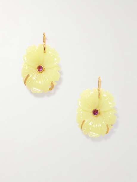 Lizzie Fortunato's earrings are carved to resemble flowers in bloom. Made by hand from yellow jade, they're tipped with gold-plated metal set with rhodolite at the center. The sunshine hue is pure joy.