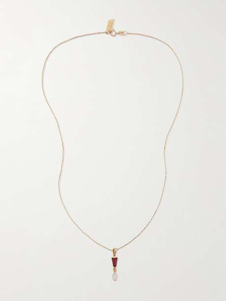 Loren Stewart's 'Carmilla' necklace is dainty enough to be worn every day. Handmade from gold, it has a fine box chain strung with a faceted garnet anchored by a glittering topaz.
