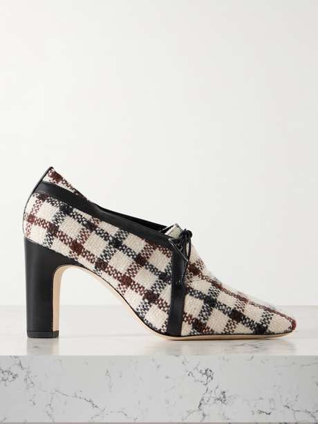 Manolo Blahnik’s ‘Stagira’ pumps channel a vintage sensibility through their checked tweed uppers. Accented with smooth black leather, they have 90mm block heels and squared toes for a polished, timeless feel.