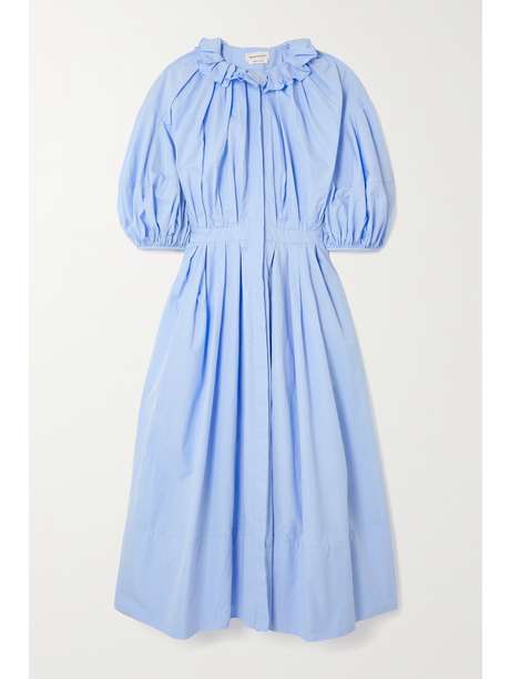 Alexander McQueen's midi dress is a lovely example of the brand's take on Victoriana. Cut from crisp cotton-poplin that's pleated to create shape, it has voluminous balloon sleeves and a sweet ruffled collar. Complement the soft light-blue hue with white accessories.