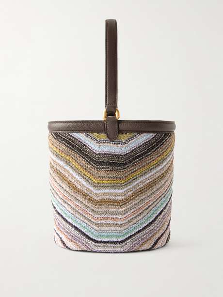 Missoni reinterprets the classic bucket bag through its signature chevron motif. Crafted from leather with a crochet-knit overlay threaded with metallic fibers, it has a subtle sheen and comes with a removable pouch for smaller essentials. It fits your phone, wallet, and keys.