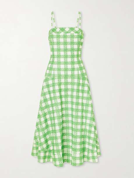 Rosie Assoulin is known for playful, sculptural dresses that blend bold details with wearable elegance. The 'Drop Me a Note' midi dress is crafted from checked cotton and features a fitted bodice with slim straps, flowing into a soft, airy skirt.
