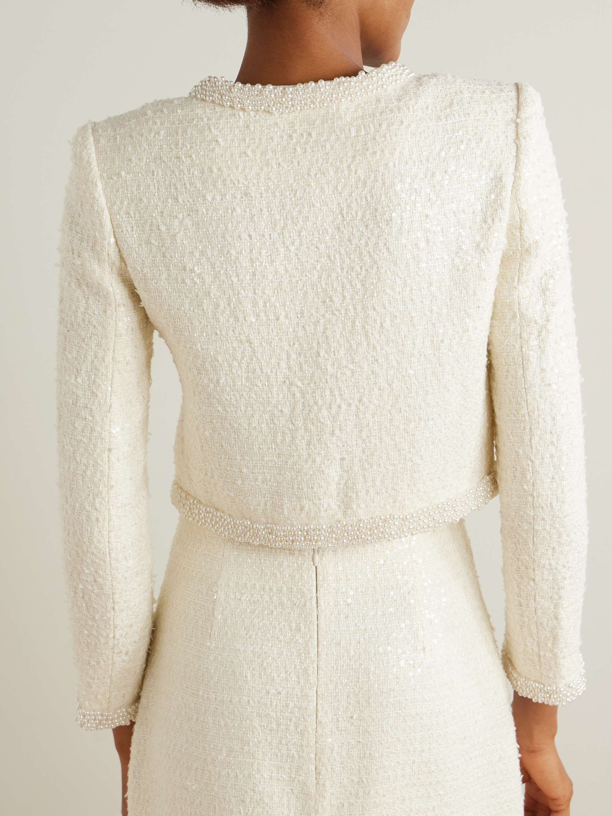 SELF-PORTRAIT Cropped faux pearl-embellished sequined tweed jacket