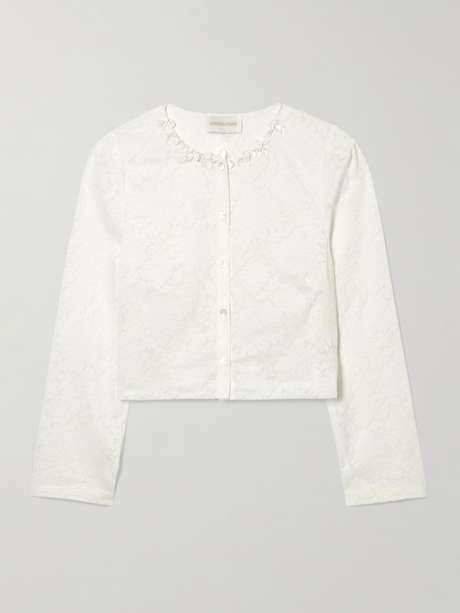 SHUSHU/TONG's pretty sensibility is partly inspired by Japanese street style and Lolita aesthetics. One half of a coord, this top is tailored from lace in a cropped silhouette. We love the beading and half-moon pailettes along the neckline, too.