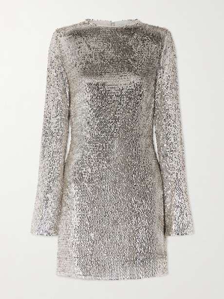SIMKHAI’s 'Opal' dress is designed to shimmer from every angle. Cut from lightweight mesh, it’s hand-embellished with sequins that create a fluid, mirror-like finish. The close fit and mini length balance the modest high neckline and long sleeves, giving it a sleek, modern edge.