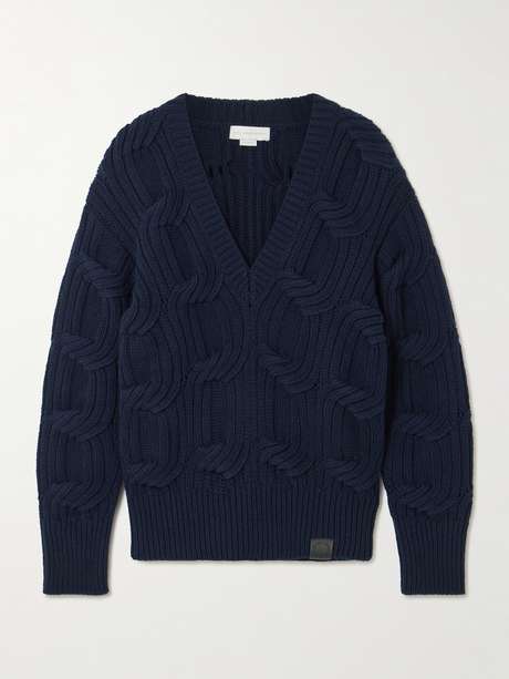 Stella McCartney's V-neck sweater has been knitted in Italy from soft wool in a chunky gauge. The curved cable stitches are inspired by the label's 'Falabella' chain.