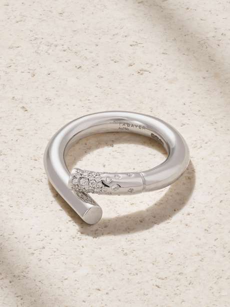 Tabayer designer Nigora Tokhtabayeva grew up in a family where jewelry was passed down from one generation to the next and it's her aim to continue that tradition with her collection. This Italian-made 'Oera' ring is handcrafted from 18-karat white gold and inlaid with a cluster of diamonds on one end.