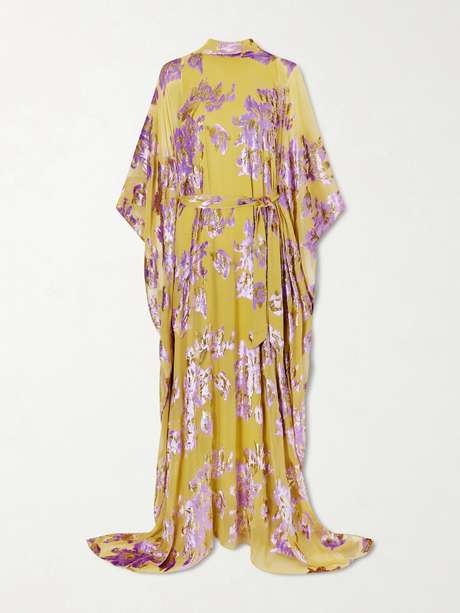 Taller Marmo’s ‘Leonor’ gown captures the label’s opulent spirit. Crafted from silk devoré-velvet, it’s patterned with shimmering florals that come alive with movement, draping fluidly from a high neckline to a sweeping hem. Flared sleeves and a matching belt softly define the shape.