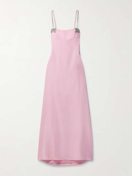 Valentino Garavani's gown is topped with a set of crystal-embellished bows - a detail seen throughout the house's Spring '24 collection. Cut from silk-crepe in a romantic 'Taffy' hue, it fits slim before opening to a relaxed floor-sweeping skirt. Wear yours with the brand's 'Rockstud' sandals.