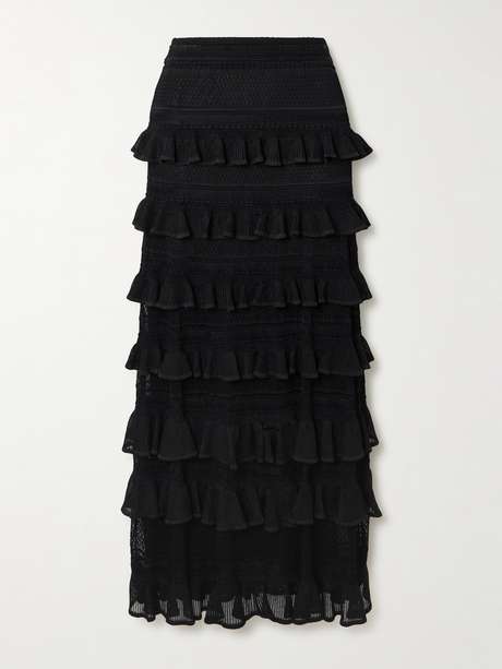 In an understated black shade, Zimmermann’s crocheted skirt channels the label’s ethereal flair. It falls in cascading tiers accented by delicate ruffles. Pair yours with pumps for a refined evening look.
