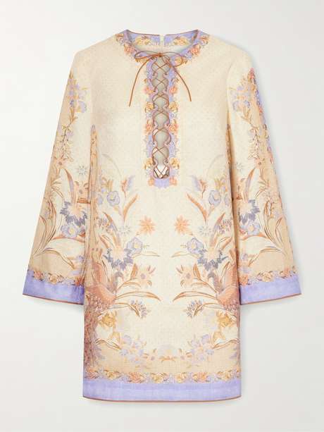 Zimmermann's 'Indra' mini dress reflects the label's romantic, feminine sensibility. Made from breathable linen in a clean, tunic-like silhouette, it features a scalloped open neckline with a crossover cord fastening. It is printed with a mix of floral, micro-check and polka-dot patterns that add a playful finish.