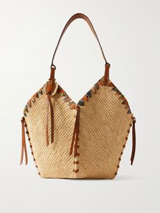 ISABEL MARANTTampa whipstitched leather and printed silk-trimmed raffia shoulder bag