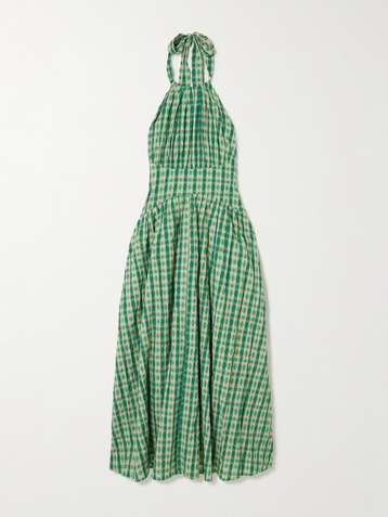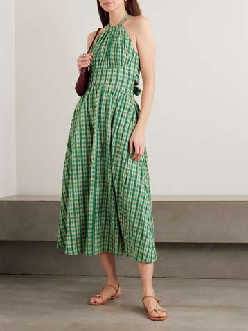 Bow-detailed checked Lyocell and linen-blend midi dress
