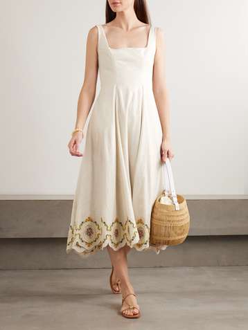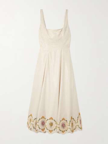 Kit scalloped crochet-trimmed embroidered cotton and linen-blend midi dress