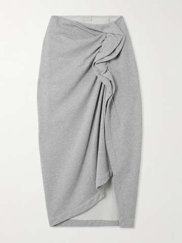 Gathered ruffled asymmetric cotton-jersey midi skirt