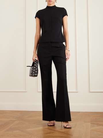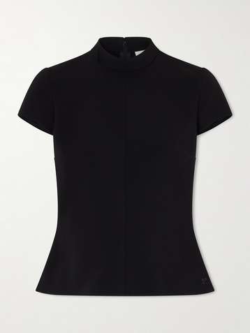 Ruched appliquéd stretch-mesh peplum turtleneck top