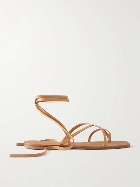 Aeyde's 'Norah' sandals are crafted from smooth leather with slim straps that frame the feet and tie at the ankles. Their flat soles offer understated comfort and versatility.