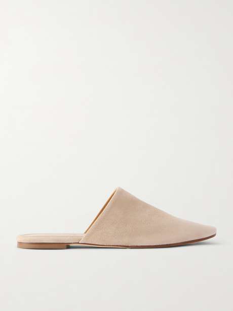 Aeyde's 'Rega' slides are crafted from velvety suede in a minimal design, with rounded toes and slim soles for understated comfort.