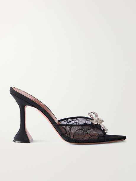 Amina Muaddi’s 'Rosie' mules are crafted from satin, featuring curved corded-lace vamps that elegantly frame the feet. Set on the label’s signature 95mm heel, they’re finished with a sparkling crystal bow at the front for a glamorous, feminine touch.